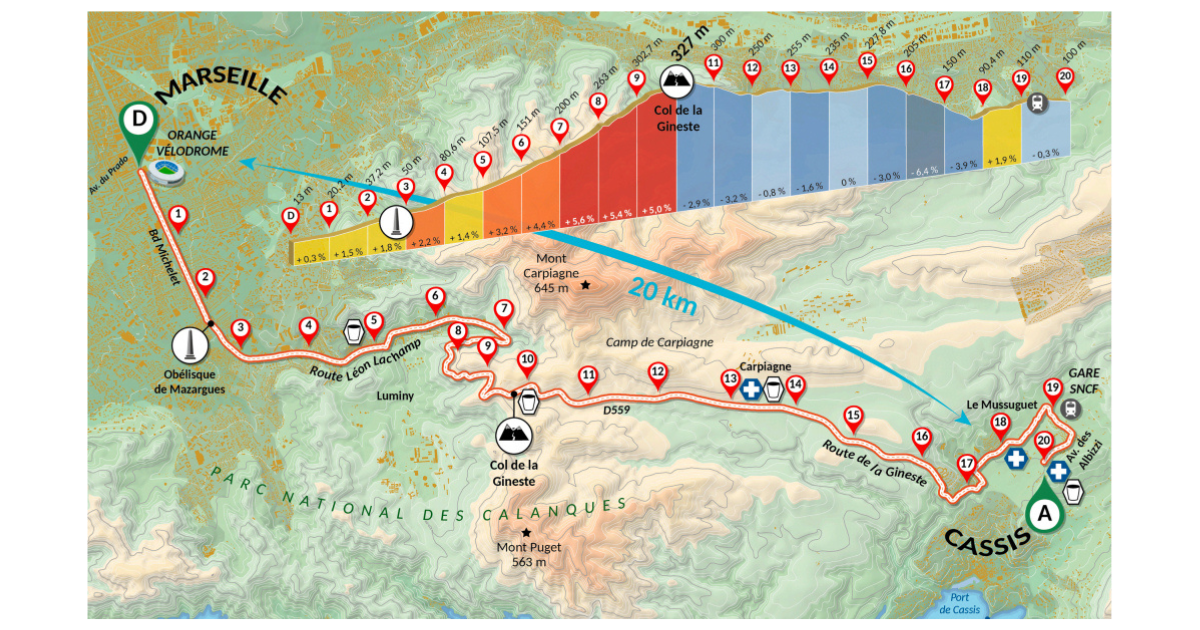 La course Marseille-Cassis, longue de 20 km, impose notamment le franchissement du célèbre col de la Gineste (327 mètres d’altitude), avec une montée d’environ 5 km et des dénivelés positifs et négatifs proches de 330 mètres.