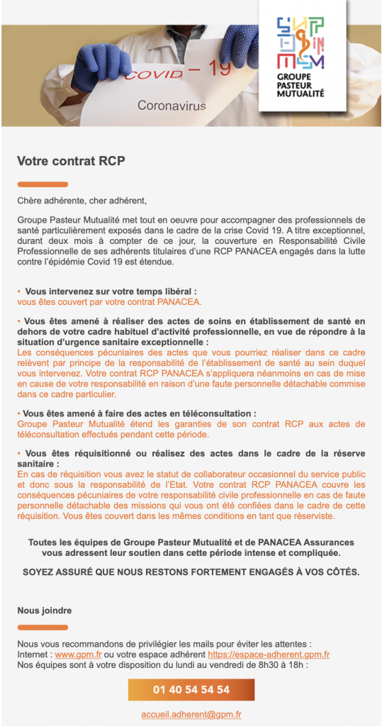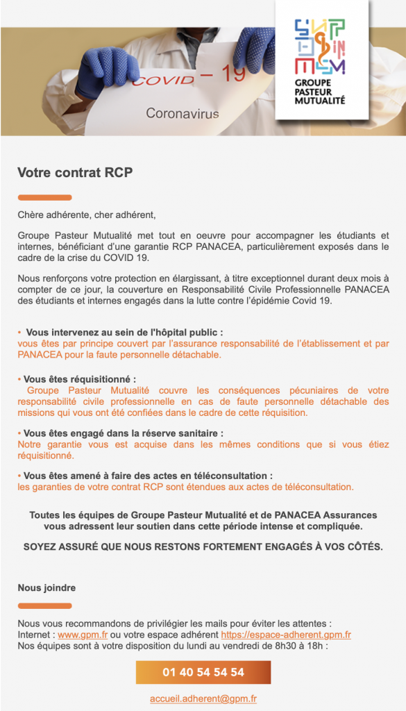 Dans le cadre de l’accompagnement de nos adhérents RCP, Groupe Pasteur Mutualité a diffusé 3 e-mailings spécifiques à leur attention : pour les étudiants/internes, pour les titulaires d’une RCP Panacea, pour les titulaires d’un contrat de coassurance Sham-Panacea.