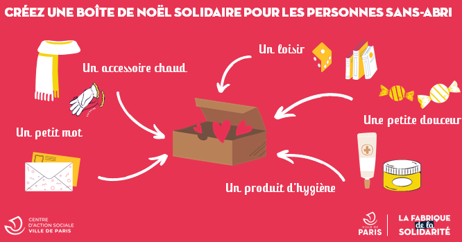 Vous souhaitez participer ? Transformez une boîte vide en boîte de Noël en y glissant : un accessoire chaud, une douceur, un petit mot, un jeu et un produit d’hygiène. Déposez la ensuite à la conciergerie.