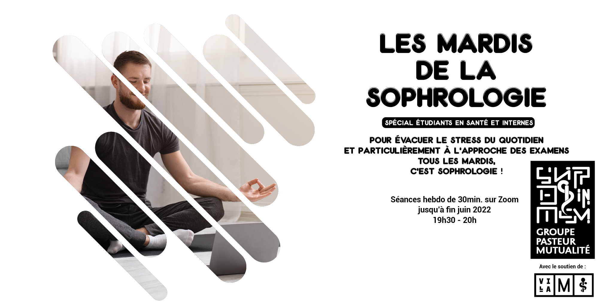 Dans le cadre de sa politique de prévention active auprès des soignants et en complément du programme « Boxe à l’hôpital », Groupe Pasteur Mutualité invite chaque mardi les internes et les étudiants en santé à participer à des séances de sophrologie. Les « Mardis de la sophrologie » ont vocation à les accompagner pendant 4 mois dans leur formation et dans la préparation de leurs examens, en leur permettant de se protéger du stress, d’évacuer les tensions et dedévelopper leurs capacités de lâcher prise.
