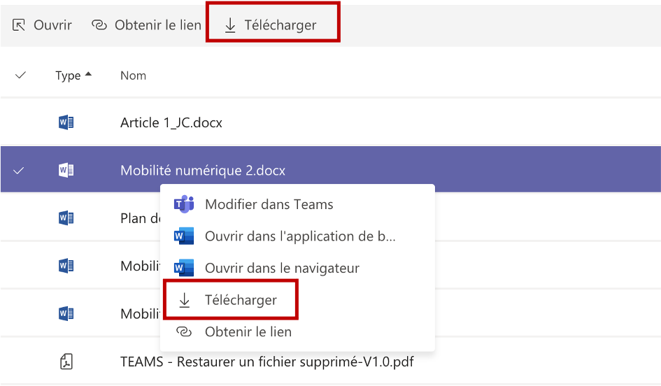 Sur Teams, sélectionnez votre document puis téléchargez-le en cliquant sur « Télécharger » dans la barre de navigation supérieure, via un clic droit « Télécharger » ou en encore en cliquant sur les trois points de suspension en bout de ligne. Les fichiers téléchargés apparaissent dans votre dossier Téléchargements de votre pc, iPad ou smartphone.