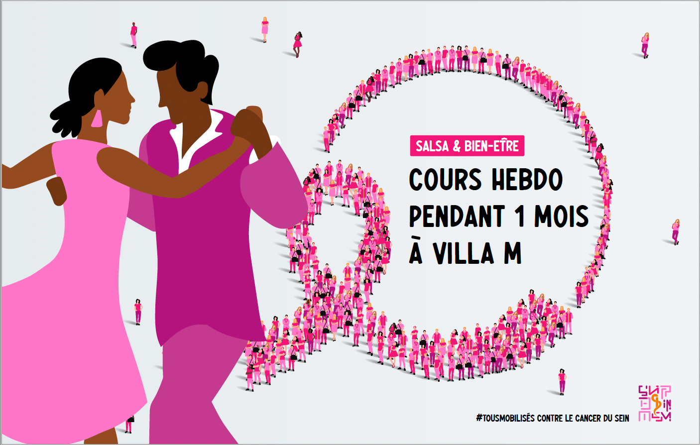 Aude vous attend à Villa M sur votre pause du midi pour des cours de salsa à quatre reprises pendant le mois d’octobre. Aude M est danseuse, chorégraphe et fondatrice de l’association « Elles dansent » qui a pour vocation de contribuer au mieux-être des personnes touchées par le cancer à travers la danse.